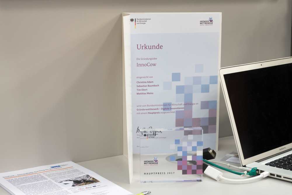 Wir haben mit InnoCow den Hauptpreis beim Gründerwettbewerb Digitale Innovationen gewonnen. Brigitte Zypries, Bundesministerin für Wirtschaft und Energie, hat uns heute auf der CeBIT in Hannover ausgezeichnet. Dabei konnten wir uns gegenüber 300 Wettbewerbern durchsetzen. Der mit 32.000 Euro dotierte Preis wurde uns von Staatssekretär Dirk Wiese überreicht. Das Bundesministerium für Wirtschaft und Energie (BMWi) prämiert mit dem Gründerwettbewerb Digitale Innovationen innovative Unternehmensgründungen im Bereich der Informations- und Kommunikationstechnologien.