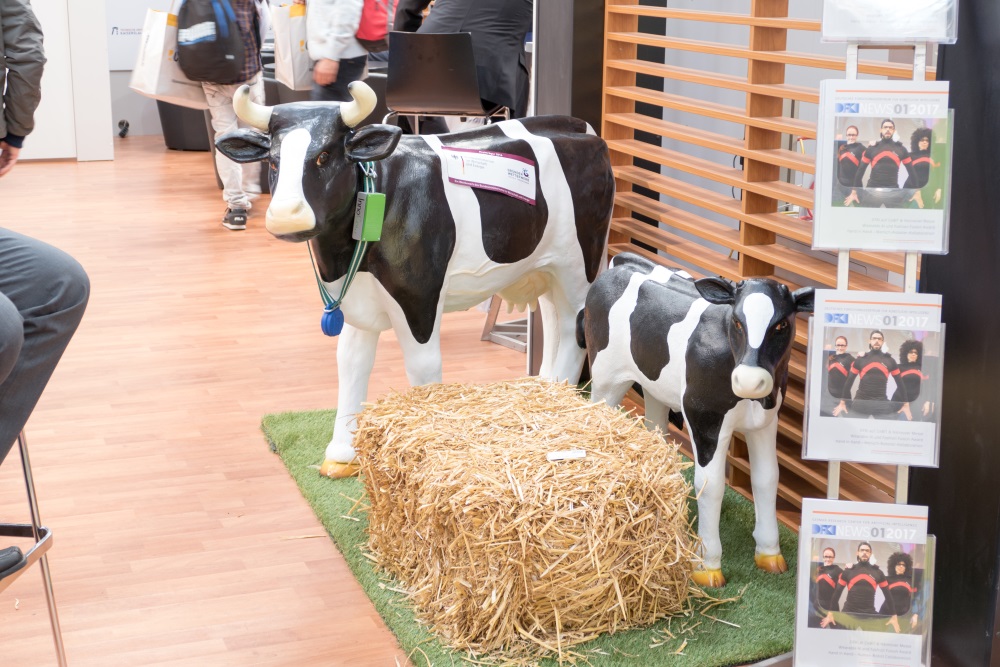Mit von der Partie waren auch unsere beiden Modelkühe Franzi und Lisl, denn Kühe dürfen unserer Meinung nach auch nicht auf der IT-Messe CeBIT fehlen. Die beiden „Damen“ hatten im Gegensatz zu uns eine entspannte Zeit. Sie hatten die wichtige Aufgabe, unser Sensorhalsband den Besuchern zu zeigen. Erwartungsgemäß erzeugten sie viel Neugier und Interesse bei den Besuchern, welche sich für die Kühe und InnoCow auf der CeBIT interessierten. Als Dankeschön hatten Franzi und Lisl immer ausreichend Stroh für sich zur Verfügung.